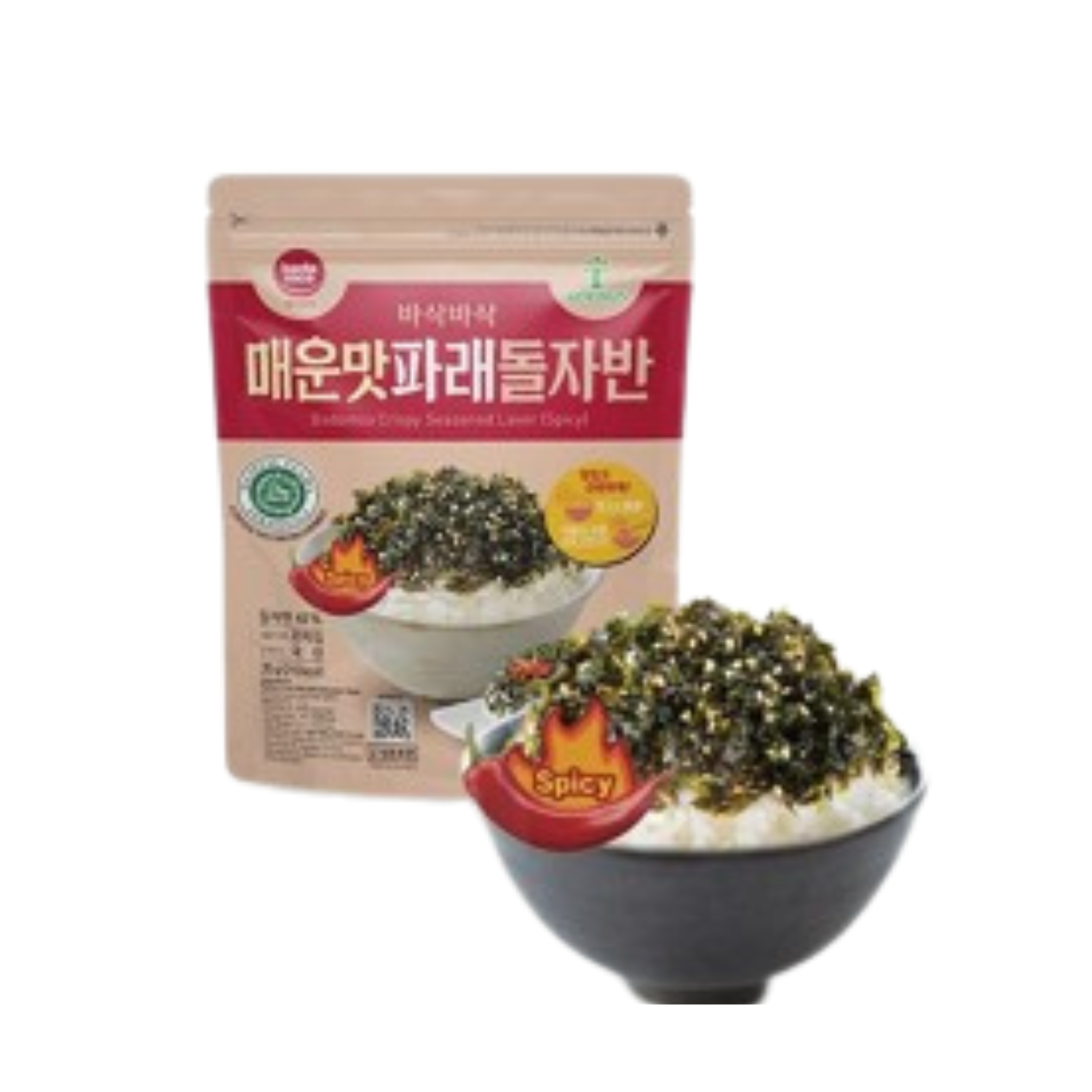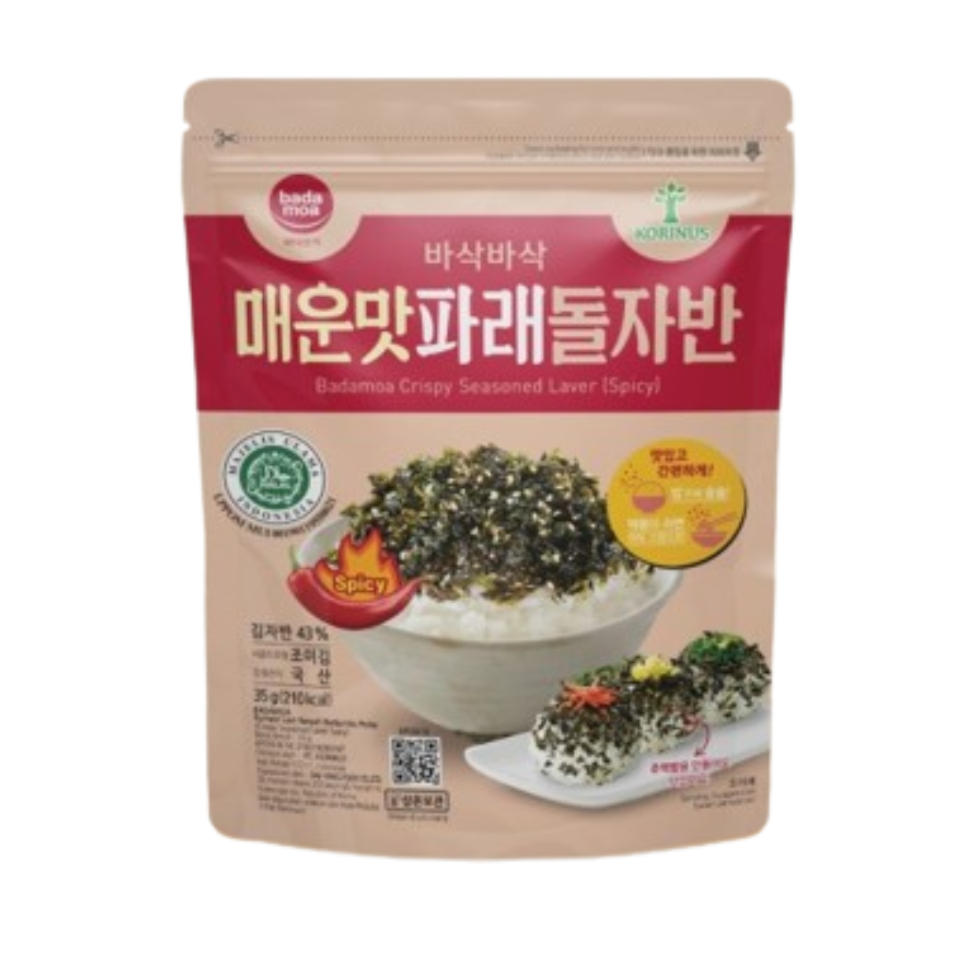 BADAMOA Crispy Seasoned Laver Spicy 35g adalah rumput laut Korea berbentuk tabur dengan rasa pedas, cocok sebagai topping nasi, mie, atau camilan langsung. Produk ini 100% halal dan asli impor dari Korea.