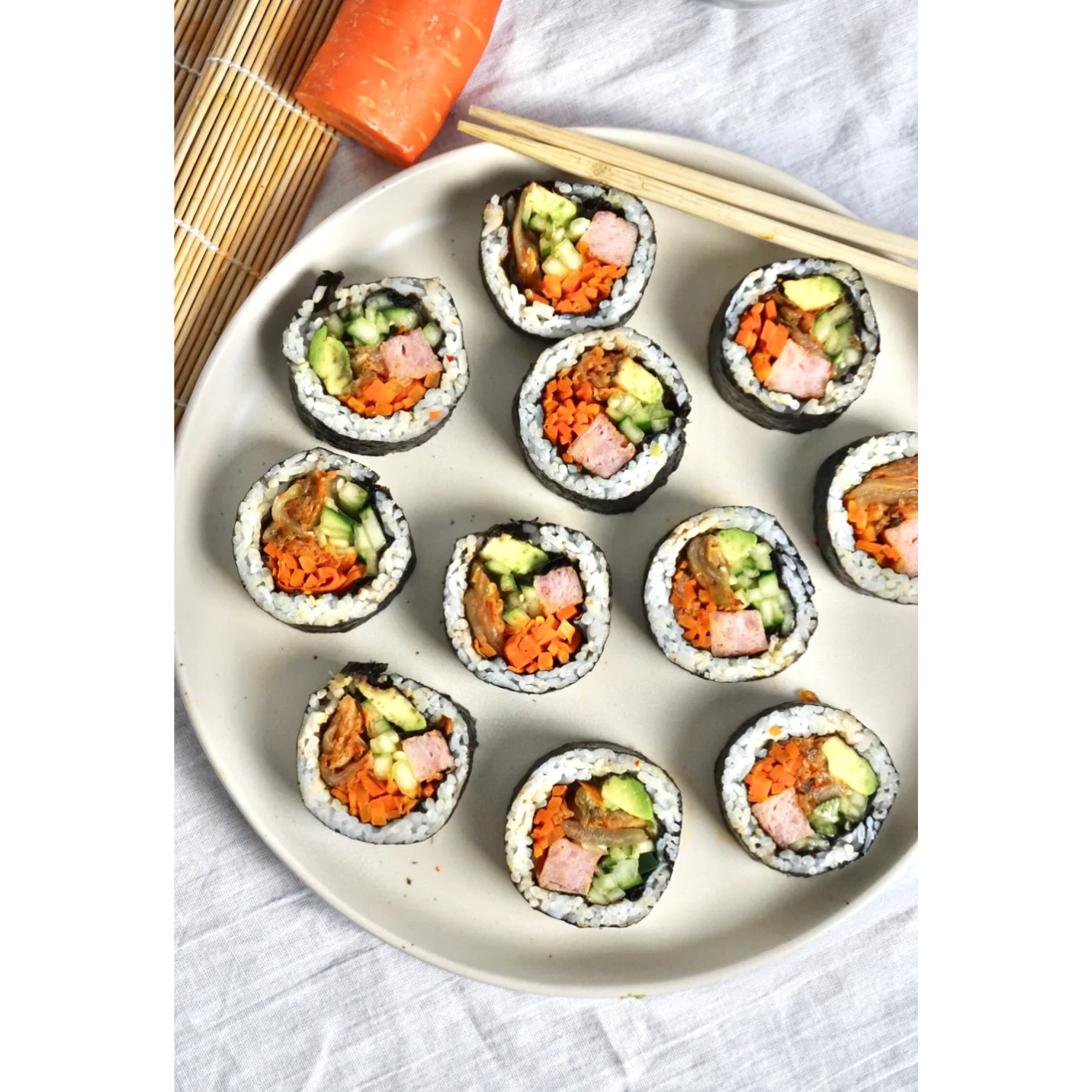 - Gimbap: Iris memanjang dan gulung bersama nasi, sayuran, dan rumput laut