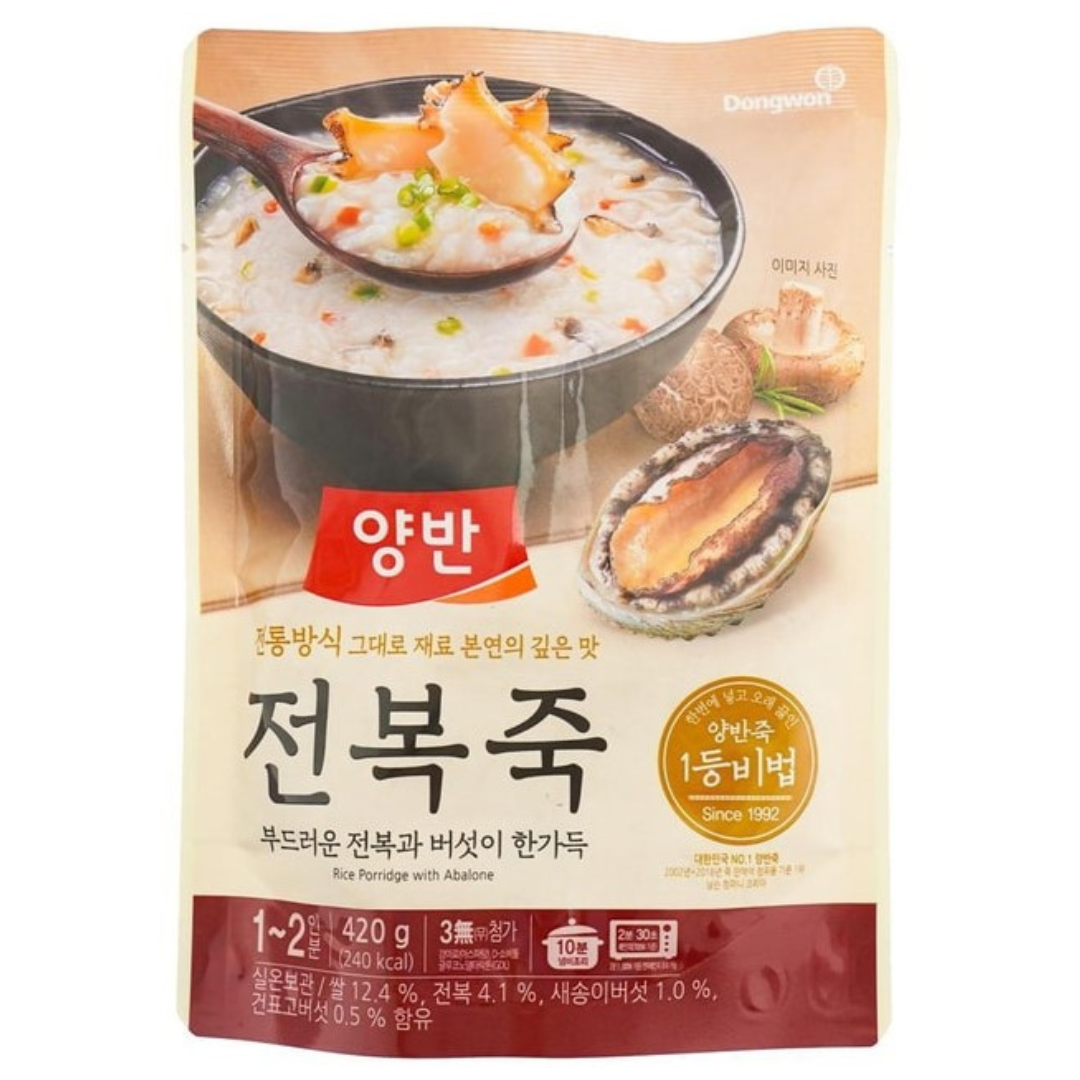 DONGWON Rice Porridge with Abalone 420g adalah bubur instan khas Korea yang menggabungkan nasi lembut dengan abalon premium, dikenal sebagai Jeonbok-juk — makanan bergizi yang dulunya disajikan untuk keluarga kerajaan.