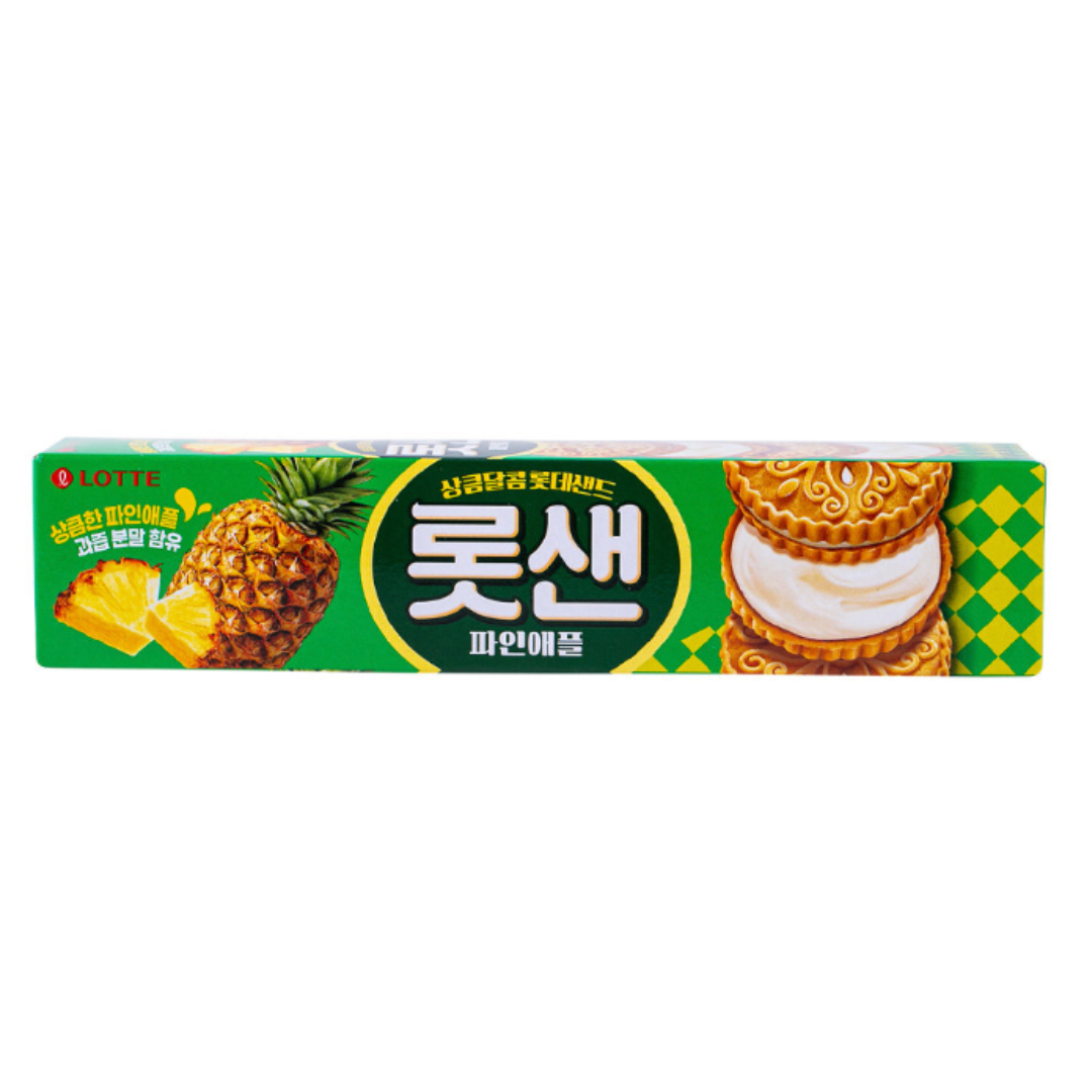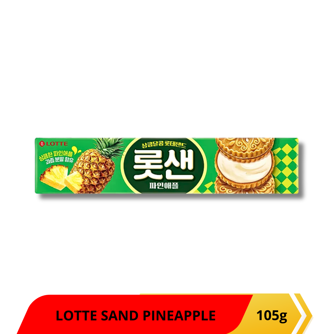 Lotte Sand Nanas 105g adalah biskuit sandwich asal Korea yang renyah dengan isian krim rasa nanas yang manis dan segar. Makanan ringan ini menawarkan perpaduan rasa tropis yang seimbang dengan tekstur biskuit mentega yang lembut. Biskuit mentega renyah dengan krim nanas di tengahnya, Kombinasi rasa manis dan sedikit asam dari nanas yang segar